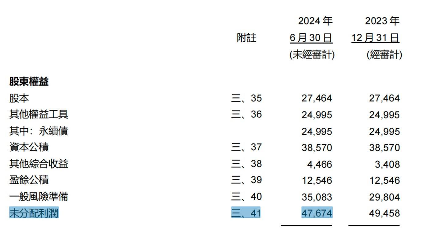 半年报显示,浙商银行上半年的未分配利润虽然不如去年同期那么多,但也有 476.7 亿。