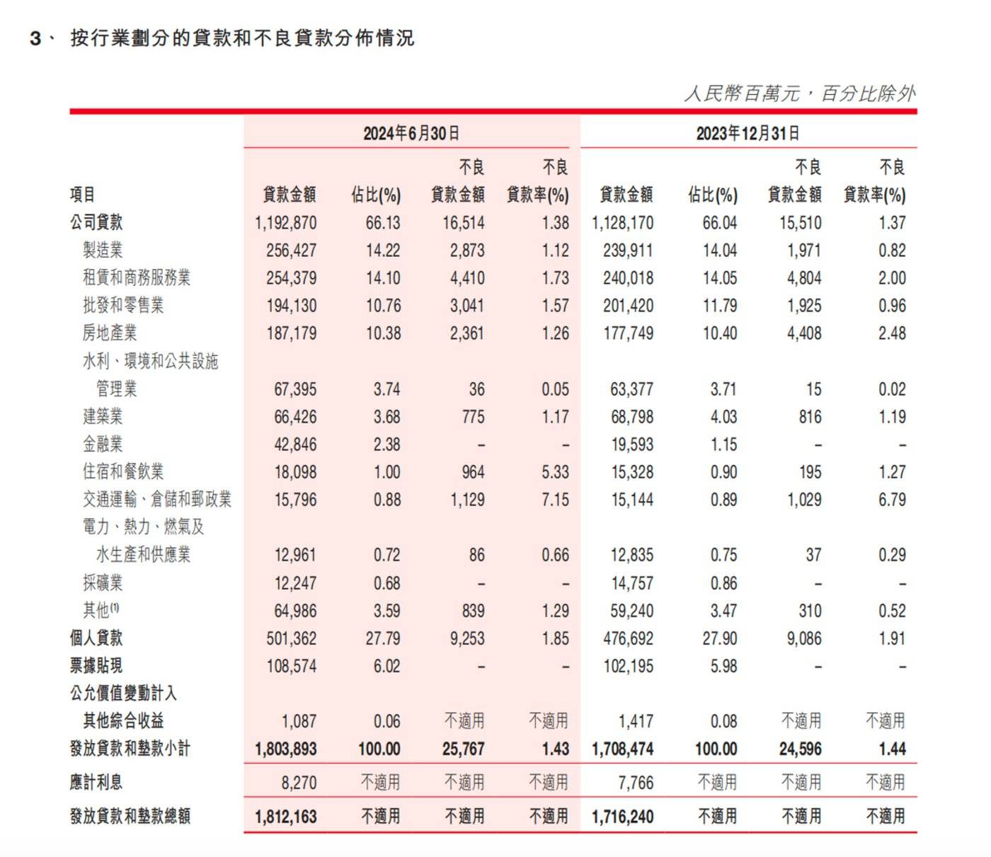 从不良贷款的行业分布来看,上半年,制造业的不良贷款率同比微增了 0.01%,零售业不良率从 0.96% 上升到 1.57%,交通运输、仓储邮政业的不良率从 6.79 上升到 7.15%,房地产的行业的不良率从 2.48% 下降到了 1.26%。整体来看 不良率表现稳定,而且微降 0.01%。