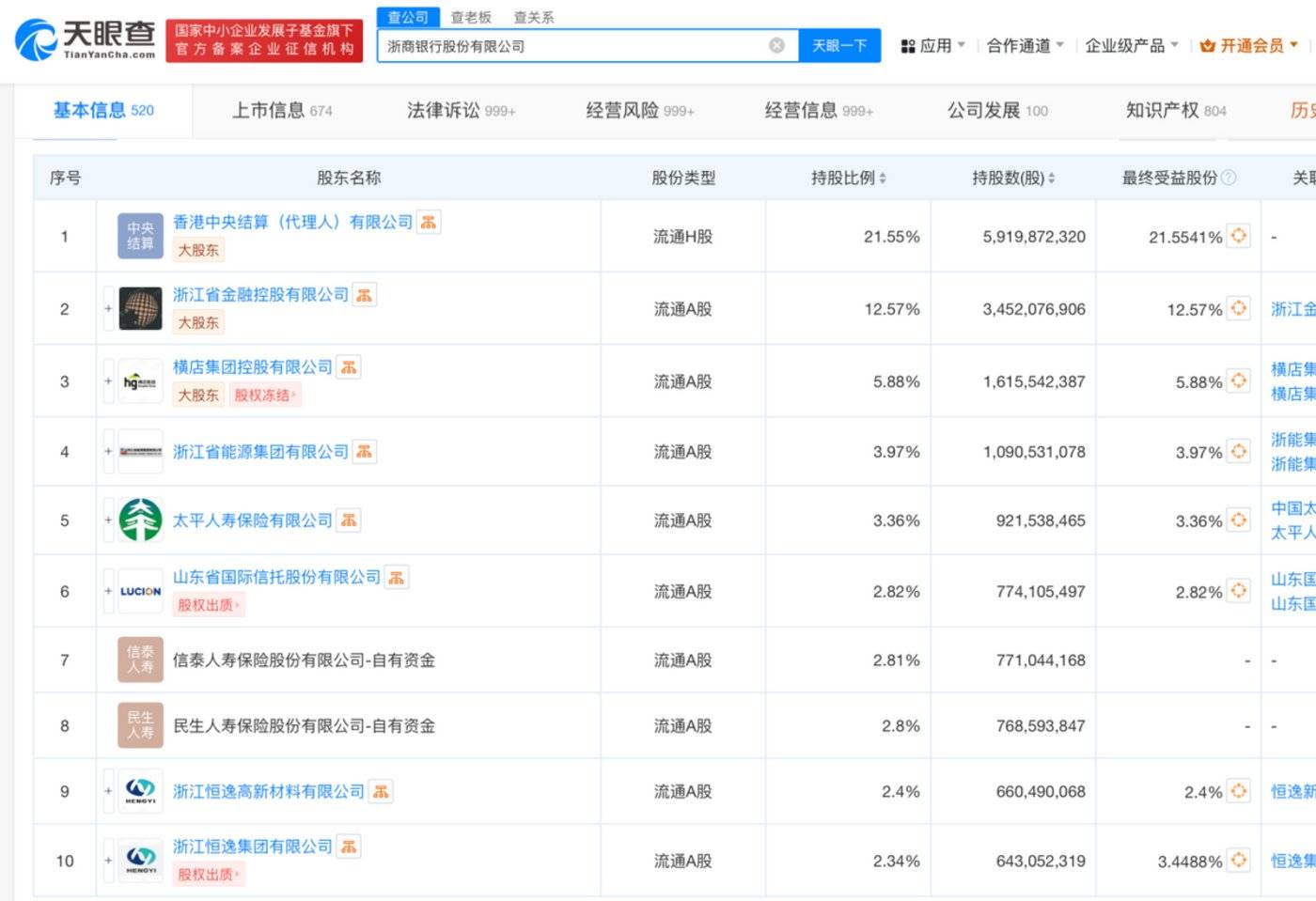 除港股持股外,天眼查 APP 显示:截至今年一季度末,浙商银行的前十大股东中第一大股东是浙江省金融控股有限公司,持股比例为 12.57%,并不满足包括 「单独或者与其他股东一致行动时,持有浙商银行有表决权股份总数 30% 以上的股份」 在内的任何一个控股股东身份条件。