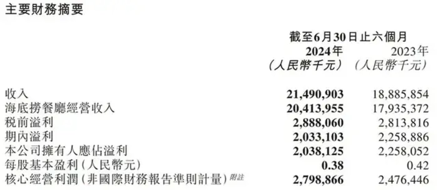 回看海底捞最新财报,2024 年上半年,公司实现营业收入 214.91 亿元,较上年同期的 188.86 亿元增长 13.8%,来自海底捞餐厅的营收为 204 亿元,较上年同期的 179.35 亿元增长 13.8%。
