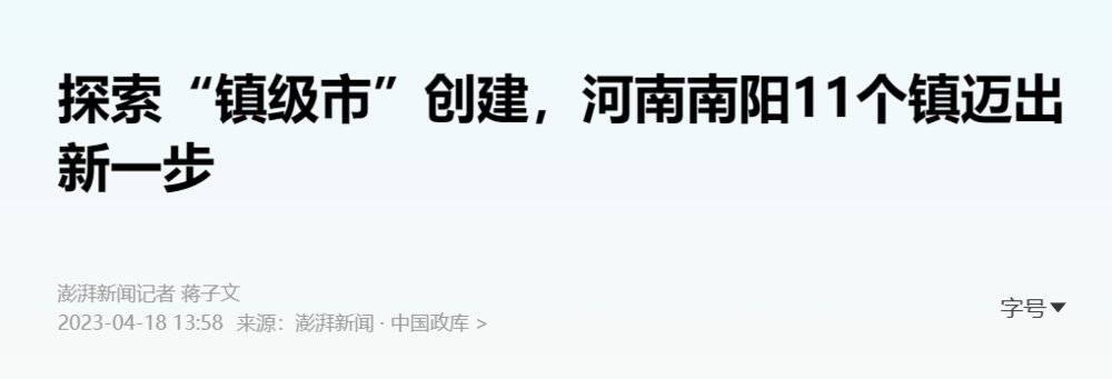 去年初,河南南阳市出台培育 「镇级小城市」 试点工作实施方案,选取了 13 个县市的 11 个镇作为 「镇级市」 探索试点。