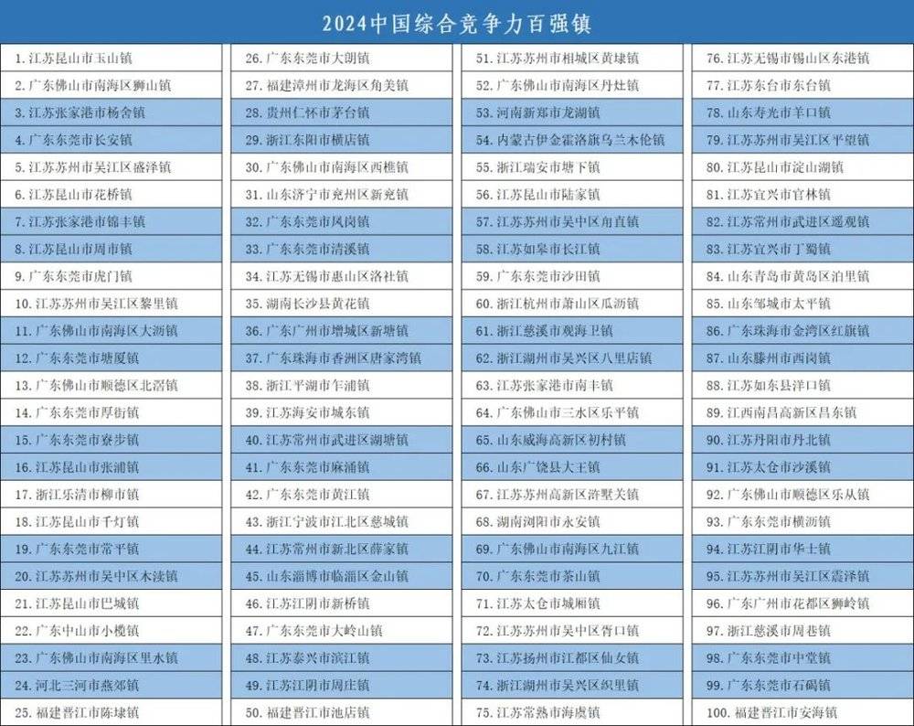 根据 2024 年全国百强镇排行榜,苏州共有 23 镇入围,东莞 17 镇,佛山 9 镇,宁波、南通、泉州也有多镇上榜,镇域经济在全国遥遥领先。
