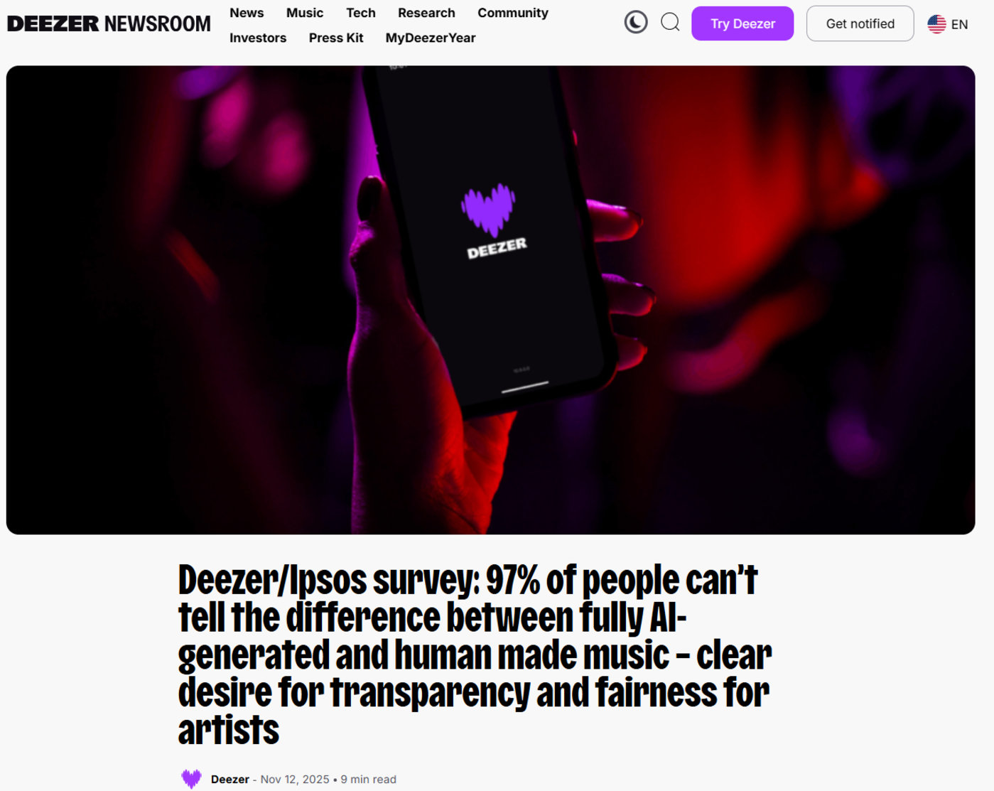 这意味着 AI 音乐的制作流程专业度和可控性进一步提升,也使作品质量再度提升,「AI 味儿」 越来越淡,甚至趋近于无。法国音乐流媒体平台 Deezer 与调研机构益普索 2025 年 11 月发布的联合调查报告显示,在法国、英国、加拿大等 8 个国家的超过 9000 名受访者中,97% 的受访者无法区分 AI 生成音乐与人类创作作品。