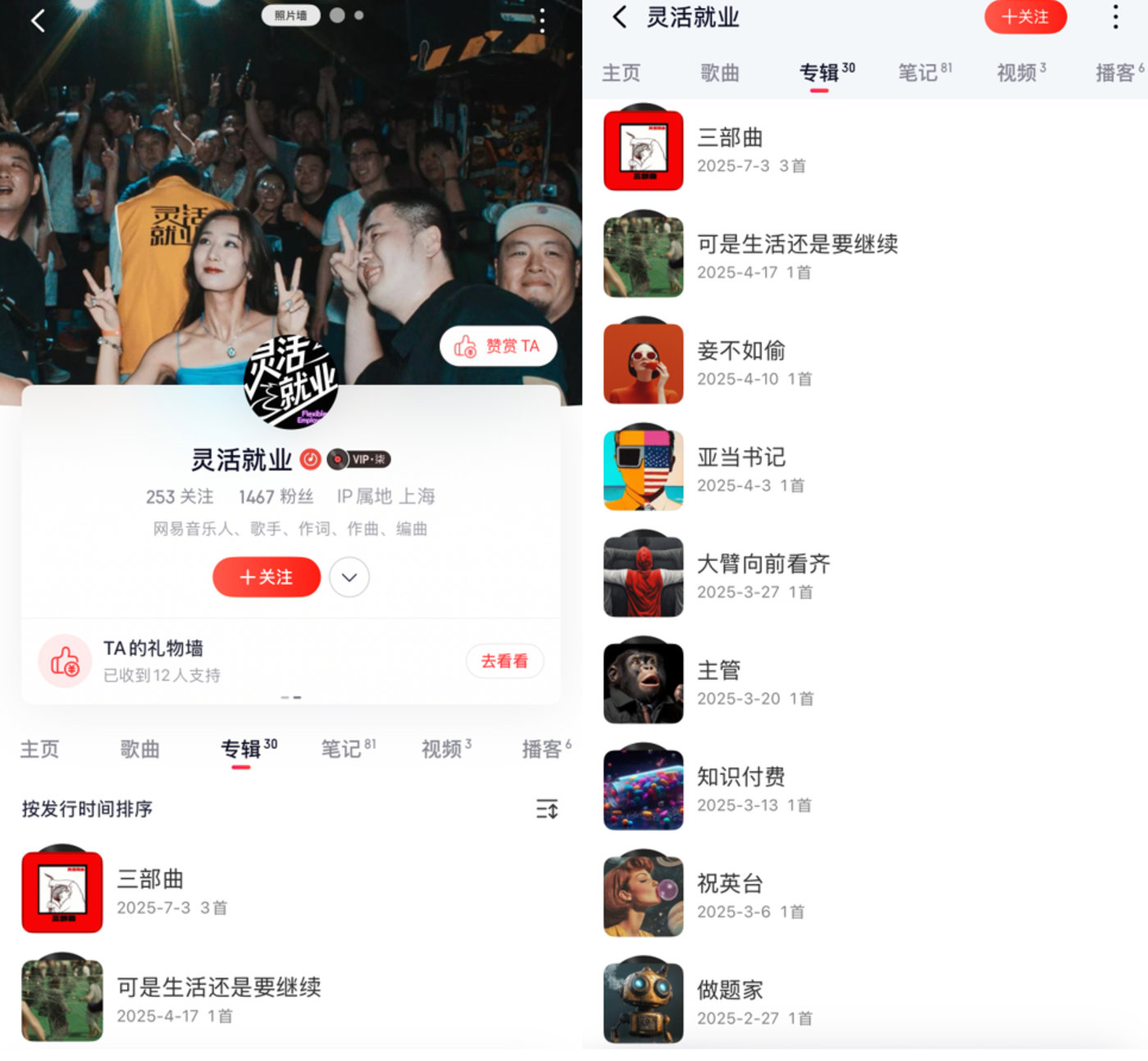 若 AI 仅部分介入创作,作品经过分段调整并由创作者进行重录和精修,那么平台进行技术甄别则更为困难。比如国内乐队 「灵活就业」 主创王博龙在播客中提及,乐队比较热门的作品 《创作者中心》《菠菜去打工》 等均有 Suno 等 AI 工具参与创作,有时他只是哼一小段旋律,就能让 AI 根据旋律把整首歌曲的编曲做完。据海克财经观察,该乐队在网易云音乐上传了超过 30 首歌曲,均未标注为 AI 音乐。