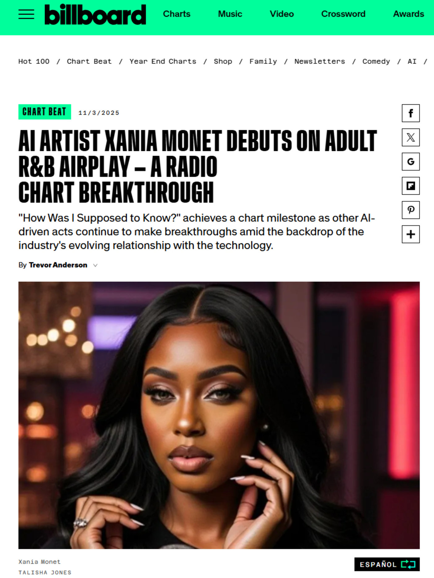 以音乐流媒体平台 Spotify 为例,Spotify Viral 50,即全球飙升榜前 50 名,在 2025 年 11 月内多次出现 AI 音乐,其中热门的 《Walk My Walk》 播放量超过 640 万。由美国诗人泰莉莎 (Telisha Nikki Jones) 利用 AI 音乐生成平台 Suno 创造的虚拟歌手 Xania Monet,在 Spotify 上拥有超过 120 万听众,其热门曲目 《How Was I Supposed to Know?》 登上了美国知名音乐榜单 Billboard。