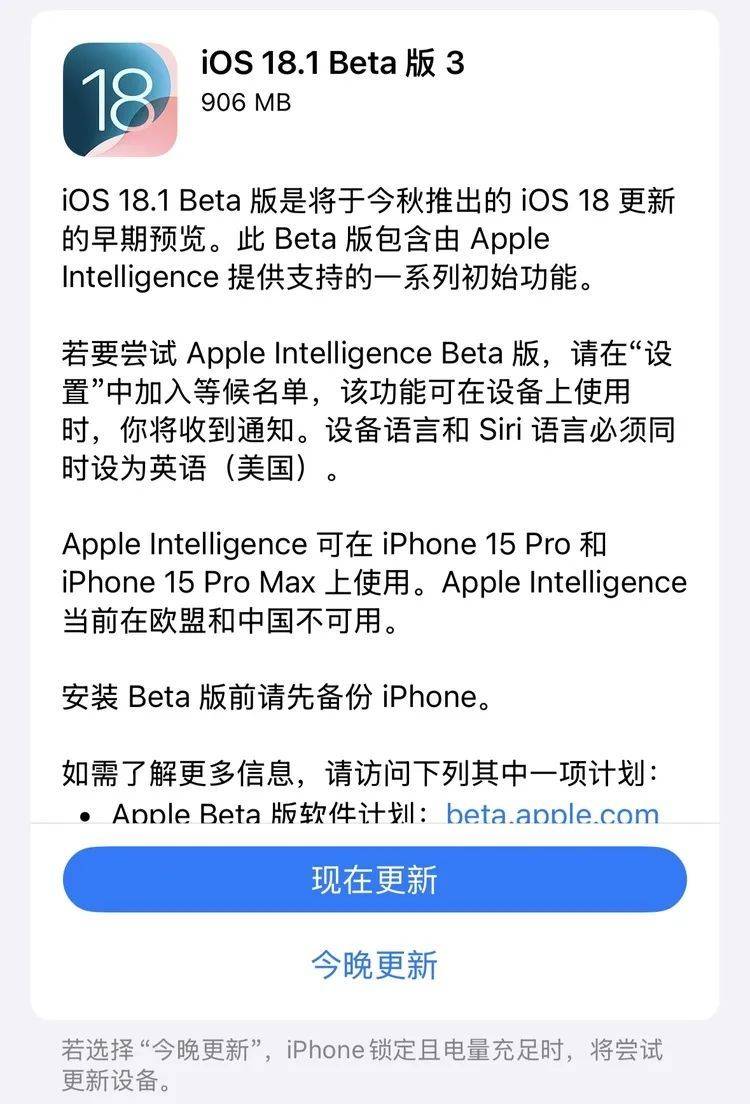 如果你已经在手里的 iPhone 15 Pro 系列上更新了 iOS18.1 Beta 3,就会在系统版本上看到很明显的一段描述:「Apple Intelligence 可在 iPhone 15 Pro 和 iPhone 15 Pro Max 上使用,Apple Intelligence 当前在欧盟和中国不可用。」