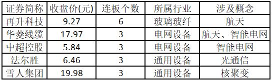 从连板情况来看,今日首板个股有 46 只;2 连板的个股有 6 只;3 连板及以上的个股有 7 只。今日连板数排名前 5 的个股包括再升科技、华菱线缆、中超控股、法尔胜、雪人集团,具体如下表所示。