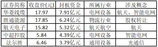 从封板资金来看,今日涨停板个股中,封板资金排名前 5 的个股包括华菱线缆、胜通能源、航天电子、中超控股、法尔胜。