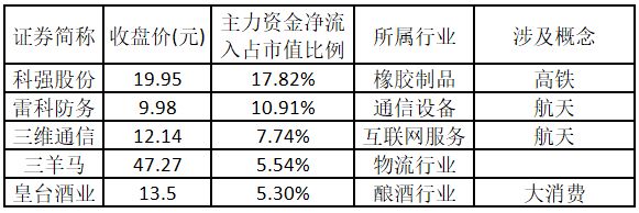 主力资金净流入金额占市值比例排名前 5 的个股分别为科强股份、雷科防务、三维通信、三羊马、皇台酒业。欢迎大家关注微信公众号 「道达号」,其 「道达涨停复盘」 栏目为大家解读。