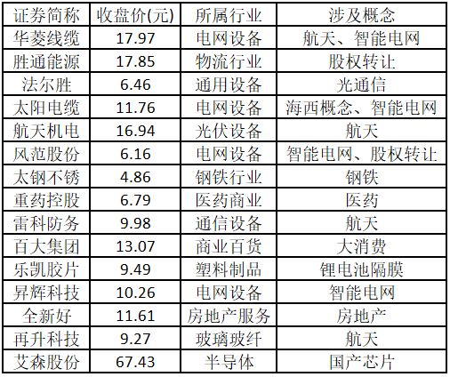 涨停板个股中,股价创出近一年新高的个股有 15 只 (不包括创出历史新高的个股),包括华菱线缆、胜通能源、法尔胜、太阳电缆、航天机电、风范股份、太钢不锈、重药控股、雷科防务、百大集团、乐凯胶片、昇辉科技、全新好、再升科技、艾森股份,具体如下表所示。