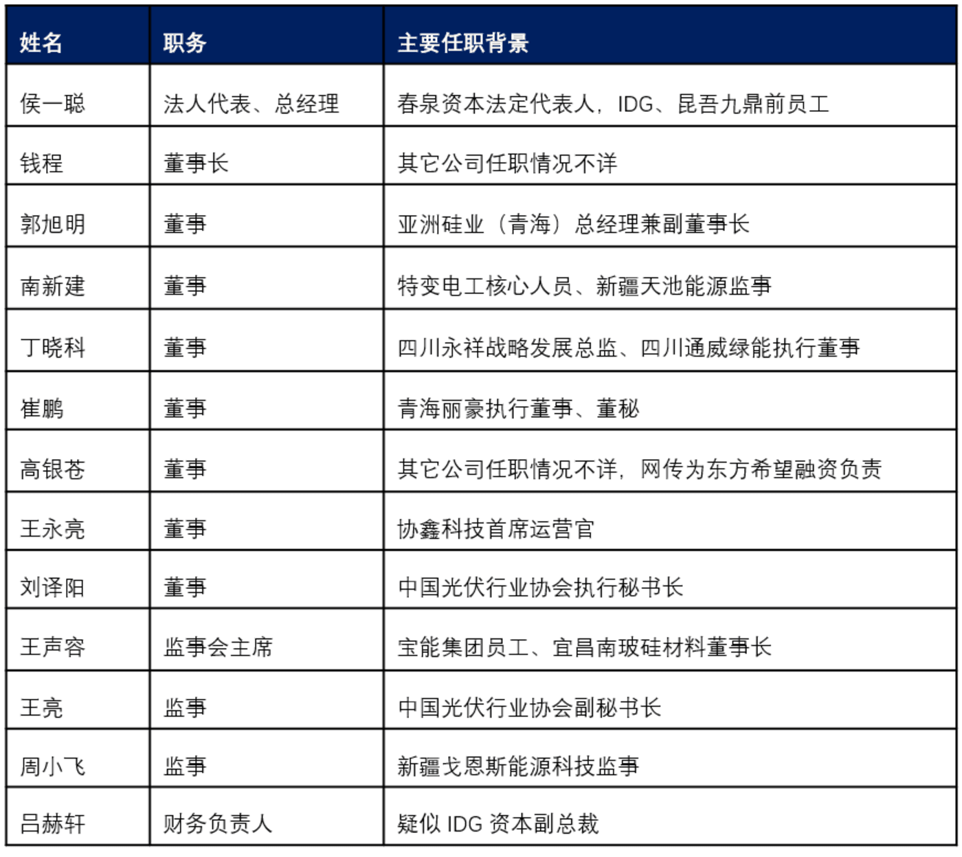 第二,此前有知情人向赶碳号透露,光和谦成法人代表、总经理侯一聪,即是光伏协会推荐的。我们前不久报道过,侯一聪,现任春泉资本法人代表,曾任职于 IDG 资本投资顾问 (北京) 有限公司,担任大项目投后负责人兼金融科技行业高级投资经理,后曾任昆吾九鼎投资管理有限公司投资总监。