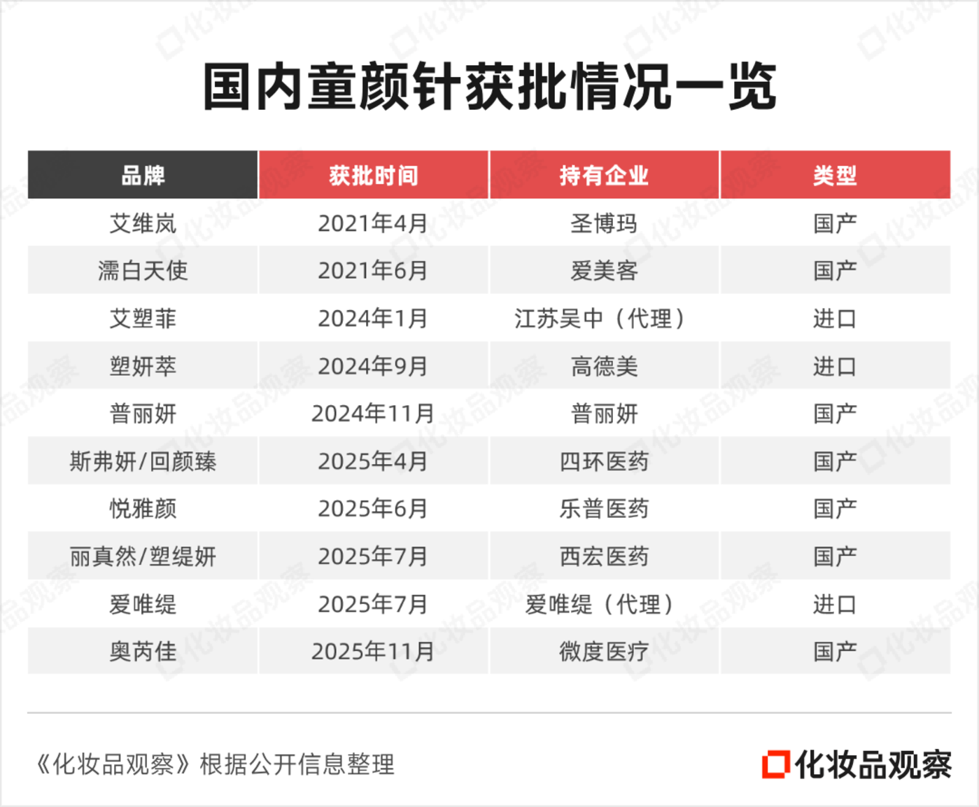 据 《化妆品观察》 不完全统计,截至目前,国内合规童颜针数量已达 10 款,形成了 「7 国产+3 进口」 的格局,特别是今年,童颜针获批提速,1 月至今已有 5 款产品获批上市。同时,有消费医疗投资人在接受媒体采访时预测,国内还有近 20 家企业在排队等待童颜针产品的注册。