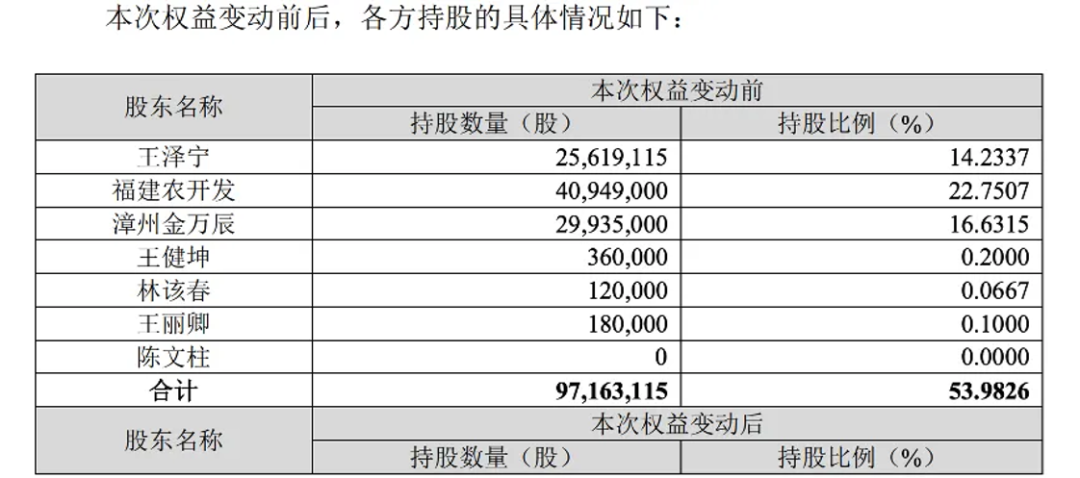 早在 2015 年,王泽宁的姑姑王丽卿以及表叔陈文柱分别以总价 1 元将其股份转让给王泽宁,后者通过福建农开发和漳州金万辰对万辰集团实现了控股。