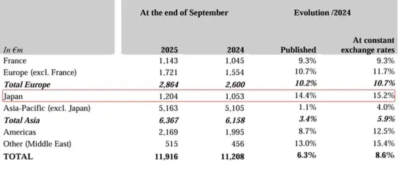 今年前三季度,爱马仕日本市场总销售额同比增长 15.2% 至 12.04 亿欧元,远高于亚太地区 (除日本)、法国和美国。