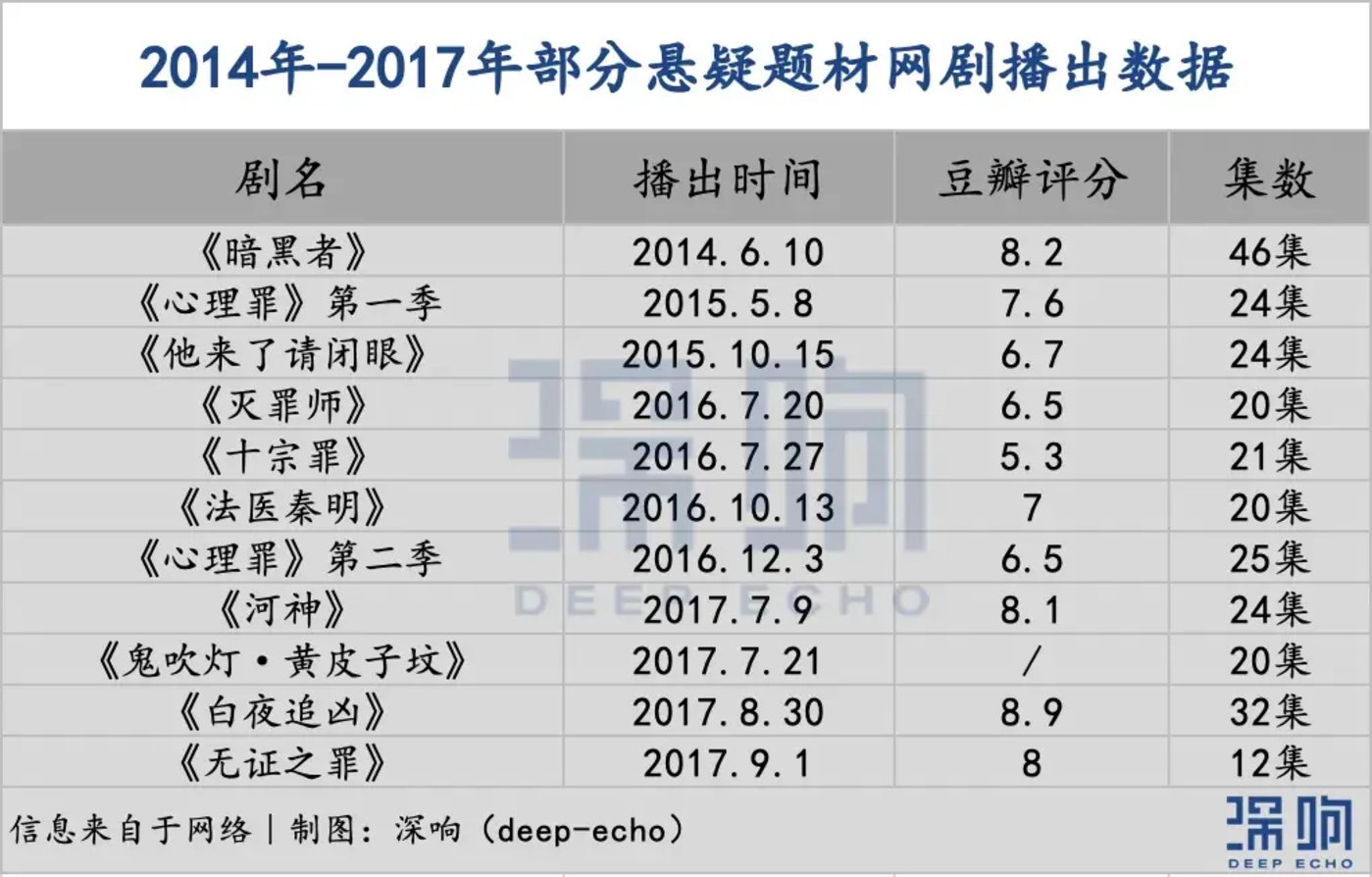 「深响」 统计了 2014 年到 2017 年部分出圈的悬疑网剧,2017 年可以说是悬疑剧的第一个小高峰,《河神》《白夜追凶》《无证之罪》 都是当年的口碑爆款剧,豆瓣评分均在 8 分以上,其中在优酷播出的 《白夜追凶》 豆瓣评分高达 8.9,刷新了悬疑网剧的评分新纪录。而他们的名字里确实带有 「罪」「凶」 等字眼。