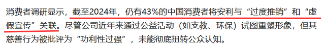 消费者调研显示,截至 2024 年,仍有 43% 的中国消费者将安利与“ 过度推销” 和“ 虚假宣传” 关联。