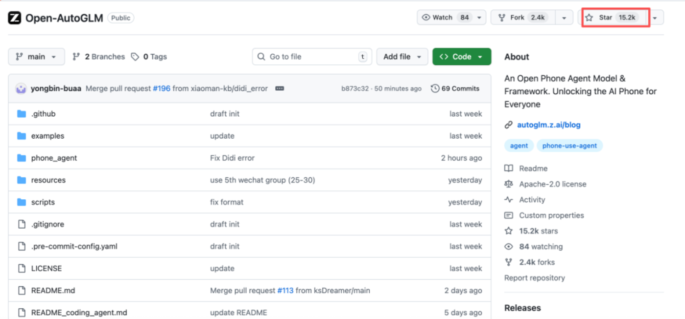 集成程度差异:豆包是系统级、软硬一体;AutoGLM 是外挂型组件;产品体验一致性不足:前者开机就能用,后者往往需要一定的技术门槛。但这并不妨碍它在开源社区的走红:项目开源仅 48 小时,GitHub Star 数从 0 飙升至 8K,截至 12 月 15 日,已突破 15K。