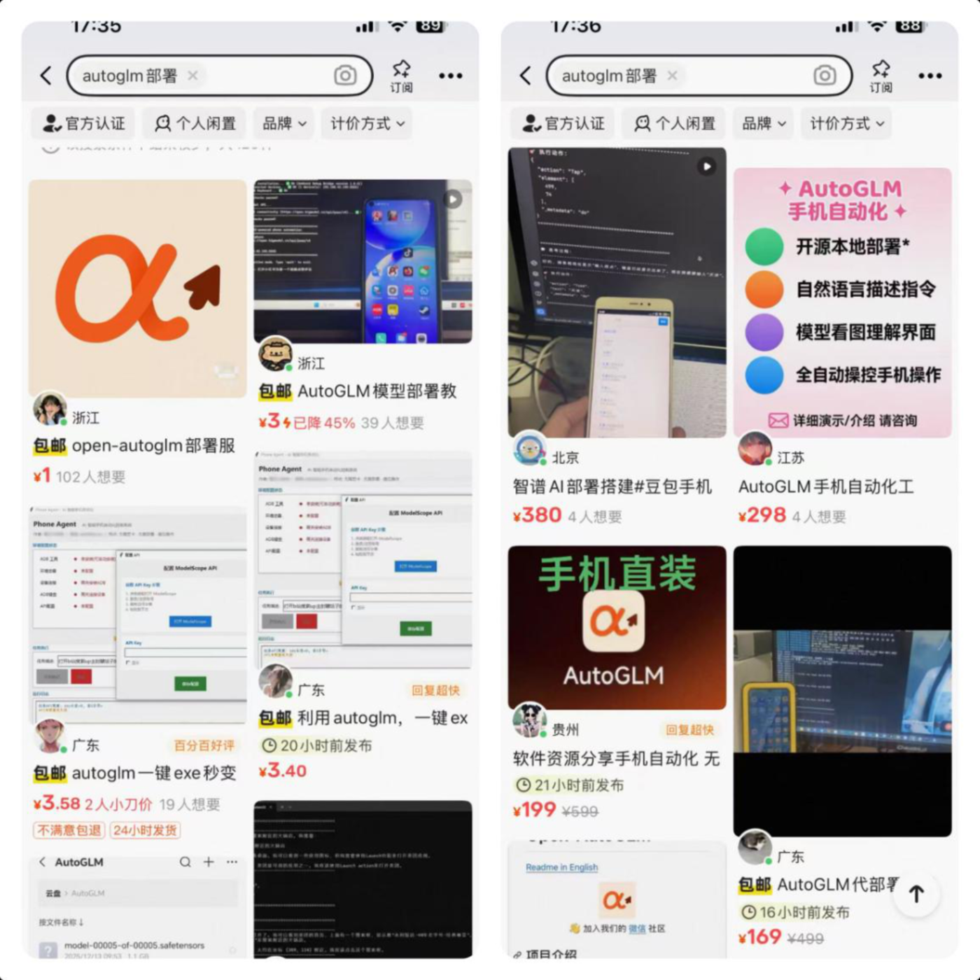 「市象」 从闲鱼平台搜索 「Autoglm 部署」 发现,有不少卖家都打出 「智谱 ai 手机部署」、「auto 手机自动化本地部署」 的招牌,从最低 1 元到最高近 500 元的价格。相比在闲鱼溢价 1 万 2 的豆包手机,可谓性价比十足。