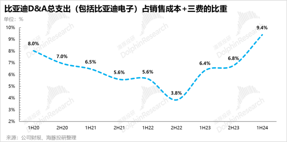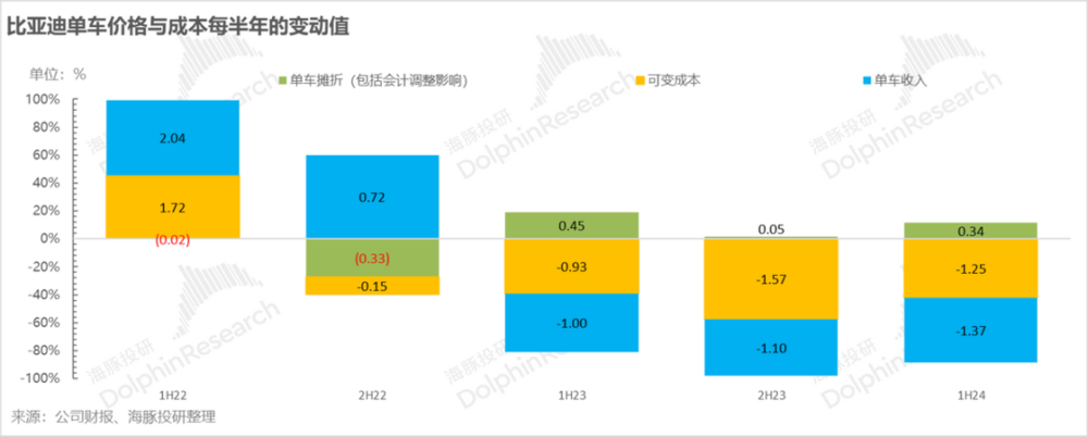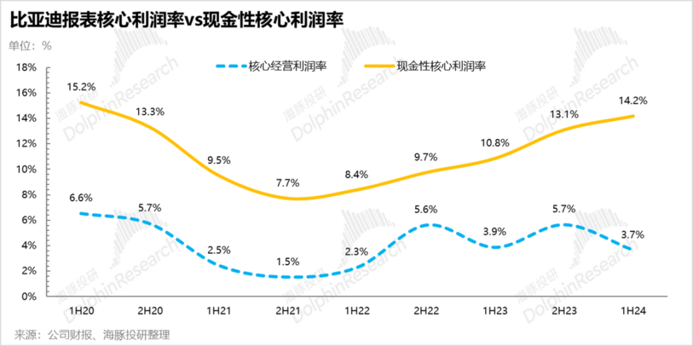 看下图,海豚君把比亚迪当中,汽车 (含电池)成本分为摊折固定成本和其他可变成本,拉出来一个踢掉摊折之后的毛利率,会发现剔摊折成本之后的比亚迪汽车毛利率趋势和公司报表上表象的毛利率趋势在两个节点,有明显背离:一个是 2023 年上半年,一个是 2024 年上半年。这两个节点都出现表象毛利率环比向下,而实际毛利率 (剔除摊折成本后)刚性向上的情景。