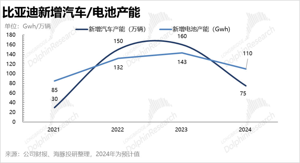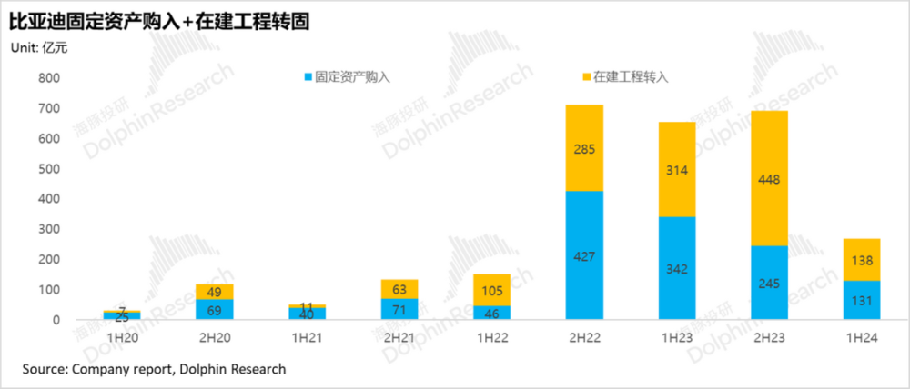 而 2024 年上半年无论是从固定资产购入额减少,还是新增在建工程和在建工程转固都呈现明显下滑趋势,以及从电池和汽车产能来看,目前和未来的在建产能都足够充裕 (海豚君预计 2024 年新能源汽车/电池在建产能也明显下滑),似乎都意味着,比亚迪在垂直一体化上前置性投入本轮已经到达了阶段性尾声。