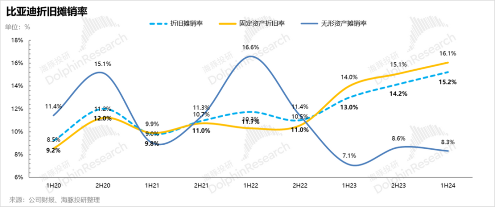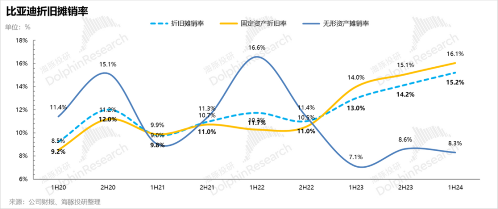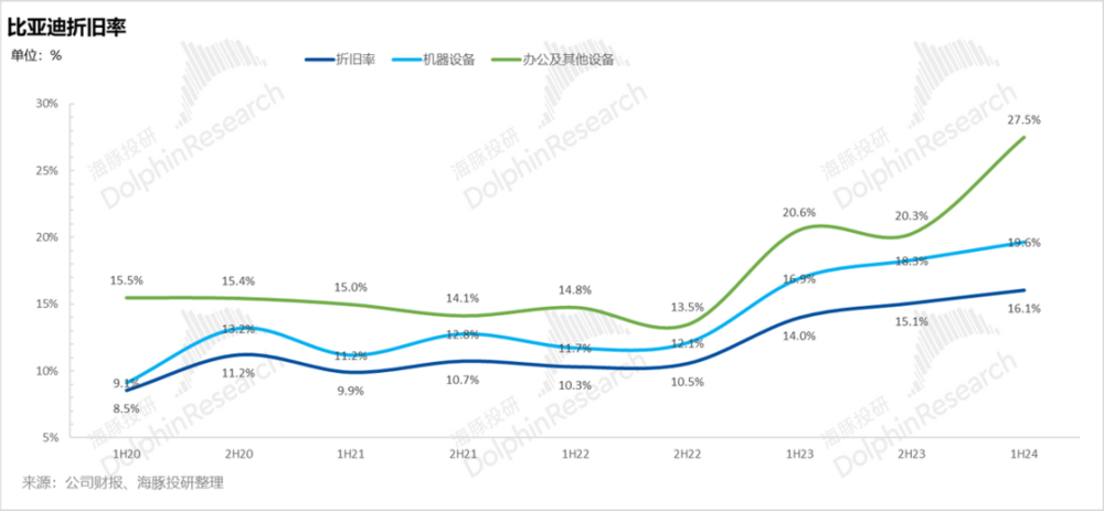 单看 2024 年下半年,由于固定资产投资已经开始放缓,海豚君就按照上半年趋势来推进,而折旧率从 2023 年起固定资产折旧率开始出现直线上升,意味着比亚迪对固定资产采取了加速折旧,我们针对下半年的固定资产折旧率做两种假设: