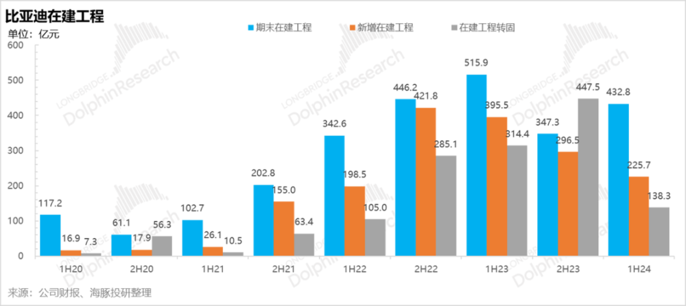 从新增在建工程来看,上一轮的密集的新增在建工程从 2021 年下半年开始,一直持续到 2023 年底,也正好对应着比亚迪汽车和电池产能的密集投入期。