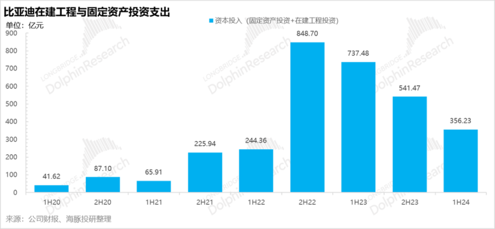 而另外一个原因则是资本开支高峰期和折旧高峰期的期限错配:2021 年下半年开始到 2023 年年底,比亚迪开始大干快上无论是固定资产投入 (就是已投产的项目加产能),在建工程 (没有投产、正在建设中的项目)的投入都是在猛拉状态。到了 2024 年,新能源市场开始肉眼可见的产能过剩,比亚迪在在建工程和固定资本投入上都开始明显放缓。