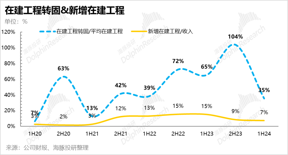 再从在建工程的转固趋势来看,在建工程转固在 2023 年下半年接近了最高峰 (占平均在建工程比例达到了 104%),但也在 2024 年上半年明显放缓,在建工程转固金额仅 138 亿,占平均在建工程比例下滑到了 35%,也呈现了明显下滑的趋势。