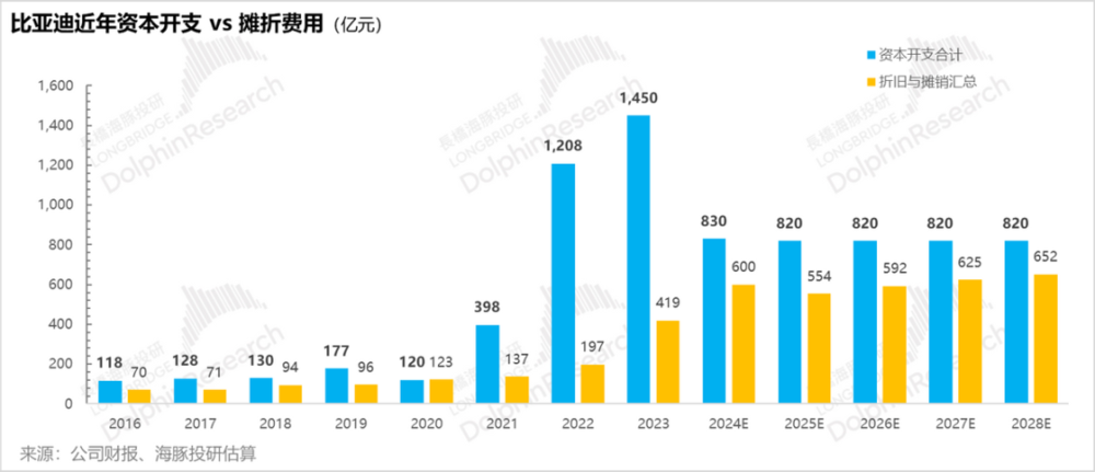 但虽然当下比亚迪的资本开支已经放缓了,但 2021 年启动的这波资本投入对利润的反噬才到了 2023 年以及 2024 年才完全呈现出来,这是因为 2021 到 2023 年的投入周期累计在一起的全量基数都进入了摊折折旧期,导致摊销折旧额终于开始快速拉高。