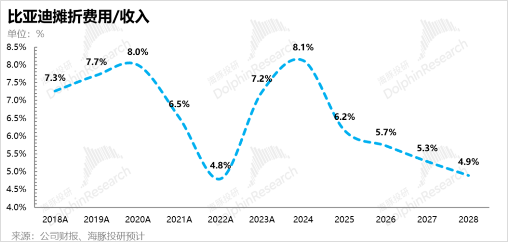 我们以最近几个半年期的单车经济来看,2022 年因为比亚迪销量释放,公司还在疯狂投产的相对早期,单车摊折费用绝对值每半年都是在减少的,所以摊折支出都是用来托举毛利率的。