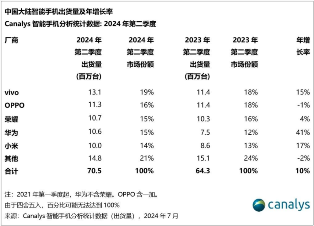 iPhone 的销量,也不再是中流砥柱。据市场研究机构 Canalys 和 IDC 发布的 2024 年第二季度中国大陆智能手机出货量排名显示,国内厂商首次包揽了中国智能手机市场前五席,苹果跌出前五成为其他。