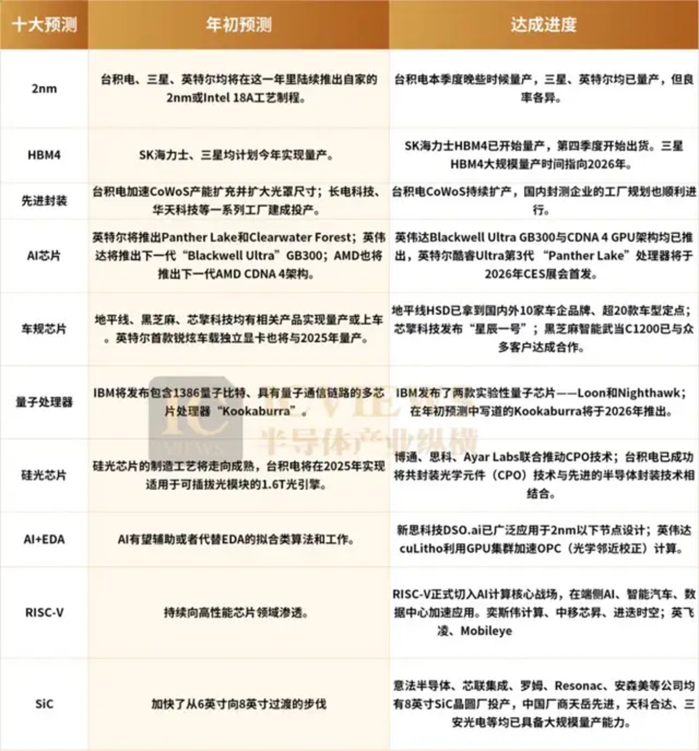 2025 年进入尾声,年初刷屏的 「半导体十大技术趋势预测」 也到了交答卷的时刻。2nm、HBM4、先进封装、AI 处理器、智驾芯片、量子处理器等核心方向,始终是行业关注重点。这一年来,这些预测的 「进度条」 究竟走了多少?今天一起顺着时间线,拆解十大方向的真实进展。