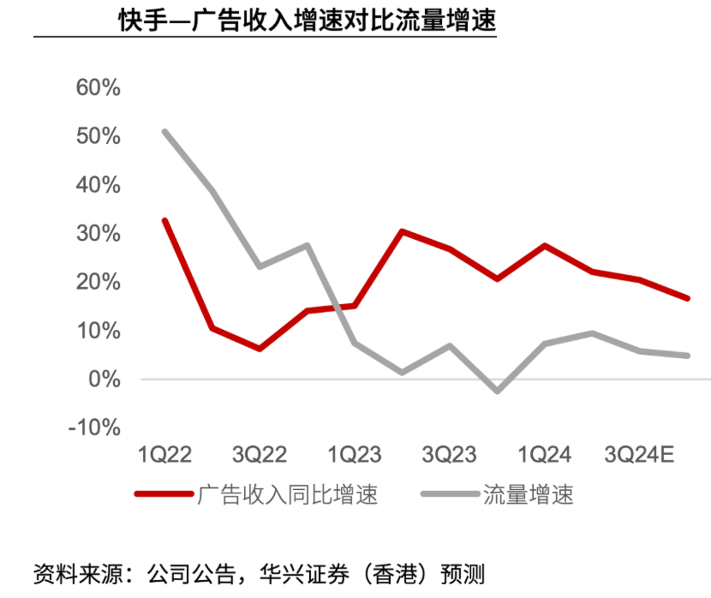 华兴证券曾测算了快手广告收入对比流量增速的情况,2023 年之后平台总流量仍然在加速增长中,对比之下广告收入同比增长却在不断下滑中。
