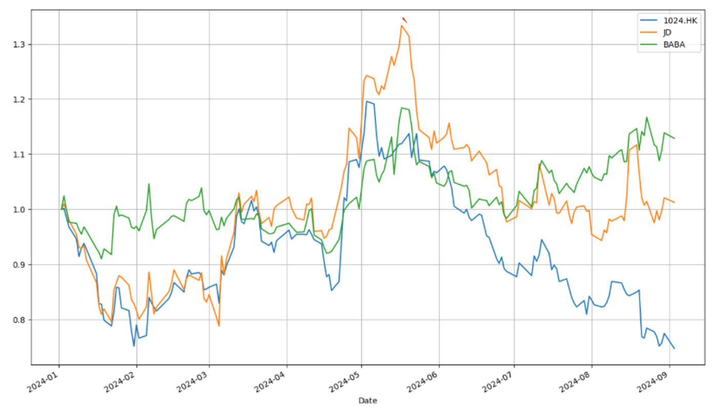 这就使得其资本市场表现与电商类企业呈现高度的相关性,上图为 2024 年至今快手与阿里,京东的市值变化情况 (起始点均为 「1」),三条折线走出了高度同频的节奏。