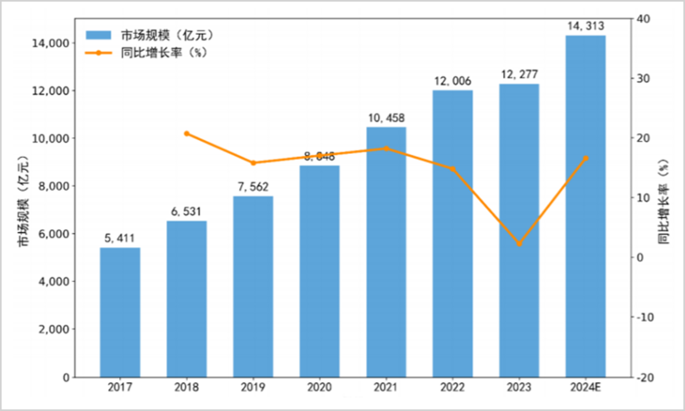 要知道,中国已连续多年为全球最大半导体消费市场,占据全球近 1/3 份额,且增速高于全球平均水平。据半导体行业协会数据,2017-2024 年,市场规模从 5411 亿元增长至 14313 亿元,年复合增速达 14.9%。