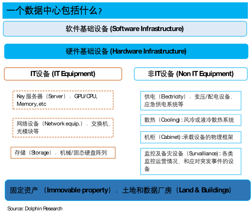 2) 第二层——IT 类设备:在土地& 库房的基础上,支撑起一个数据中心的第二层是各类的硬件设备,首先是与提供算力直接相关的各类 IT 设备,包括: