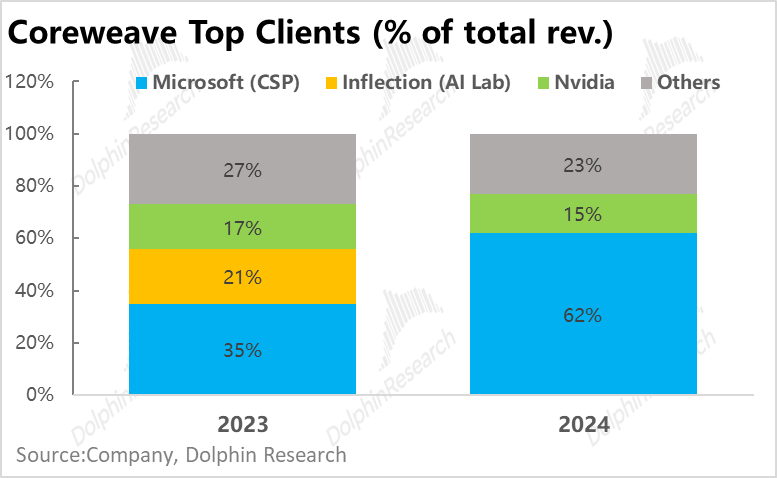 在 2024 财年 CoreWeave 约 $19 亿的总营收中,接近 80% 的收入只来自两家客户公司—— 微软和英伟达,其中微软一家就占了当年总收入的 62%。