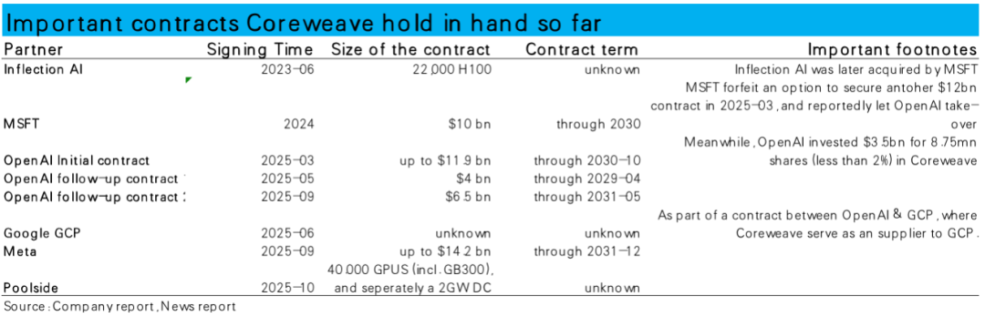 更“ 实时反映现状” 的在手合约月同样呈现用户集中的现状:在 3Q25 披露的 $556 亿未履约合同余额中,来自 OpenAI,微软和 Meta 这三家的合约金额就接近 $470 亿。