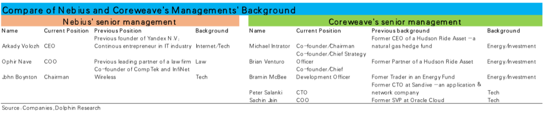 相比之下,据悉公司在新云领域内主要的竞争对手之一—Nebius 则在软件/编程能力上更有优势。作为一个侧面的证据,从两家公司的创始人和核心管理层的不同背景,也能对两家公司不同的导向窥见一二。