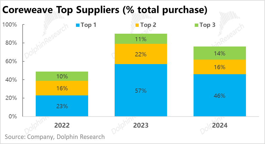 那么从逻辑上看,CoreWeave 在向上游供应链的议价能力上又是否出色?简单来说,并不好。首先三家运营商就占公司总采购额的 8~9 成,这一点就意味着一旦某家大供应商停止供货就足以对公司的供应链产生巨大冲击。