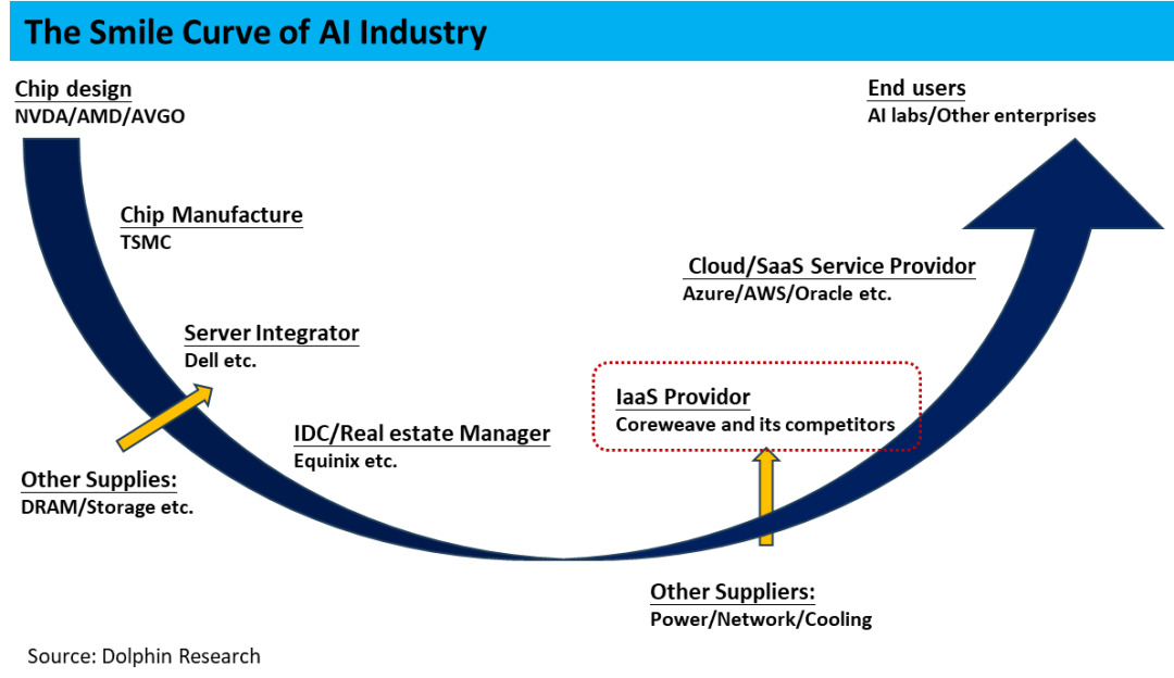 下图概括性的展示了整个云服务从上游到下游的产业链,如著名的“ 微笑曲线”,海豚君认为在算力产业链中的两端—— 更靠上游设计和更靠下游接触终端用户的部分是产业链中议价能力相对更强的。