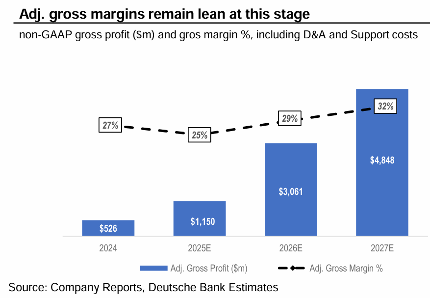 那么从结果来看,市场共识认为 CoreWeave 的真实毛利率只在 25%~30% 左右,较微软智慧云板块 60% 以上的毛利率明显偏低。也正是 CoreWeave 在产业链中议价能力不强的体现。