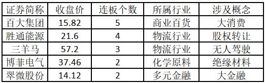 从连板情况来看,今日首板个股有 41 只;2 连板的个股有 5 只;3 连板及以上的个股有 3 只。今日连板数排名前 5 的个股包括百大集团、胜通能源、三羊马、博菲电气、翠微股份,具体如下表所示。