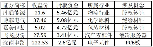 从封板资金来看,今日涨停板个股中,封板资金排名前 5 的个股包括胜通能源、博菲电气、嘉美包装、飞龙股份、深南电路。
