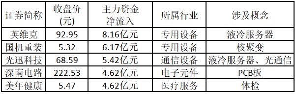 从主力资金来看,今日涨停板个股中,主力资金净流入金额排名前 5 的个股分别为英维克、国机重装、光迅科技、深南电路、美年健康。