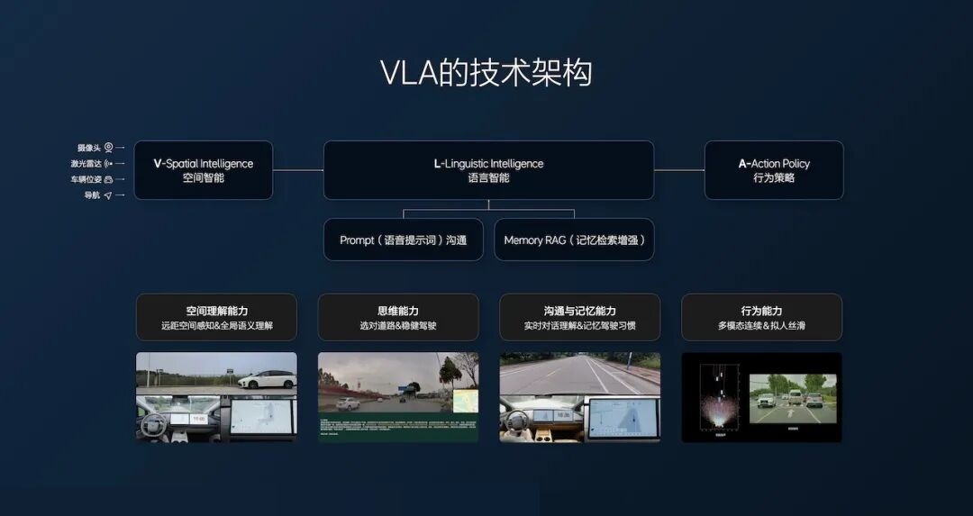 在提升汽车智能化方面,新势力车企最为激进。在 NVIDIA GTC 2025 大会上,理想汽车发布了新一代自动驾驶架构——MindVLA。它通过整合空间智能、语言智能和行为智能,赋予自动驾驶系统以 3D 空间理解能力、逻辑推理能力和行为生成能力,并计划于 2026 年量产应用。