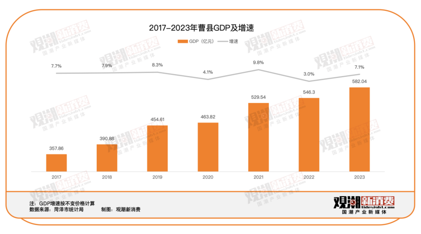 放大到整个县域,就是一个贫困县逆袭的故事。2017 年以来,曹县 GDP 稳步增长,这是曹县对网络上的吹捧与诋毁一笑而过的底气。