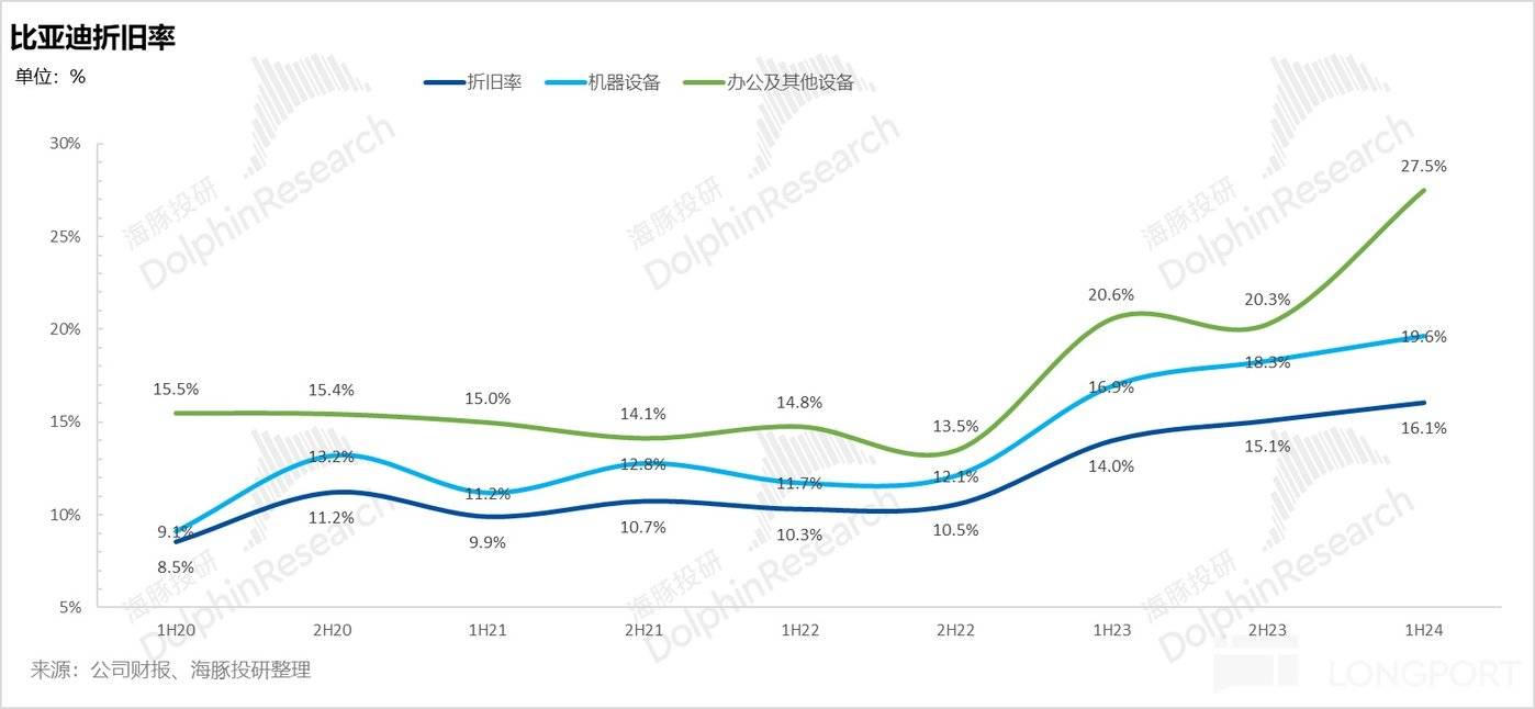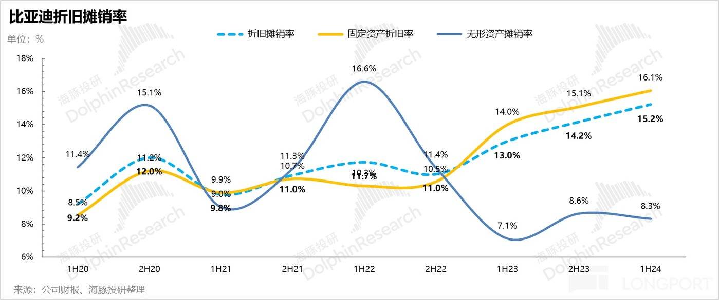 单看 2024 年下半年,由于固定资产投资已经开始放缓,海豚君就按照上半年趋势来推进,而折旧率从 2023 年起固定资产折旧率开始出现直线上升,意味着比亚迪对固定资产采取了加速折旧,我们针对下半年的固定资产折旧率做两种假设: