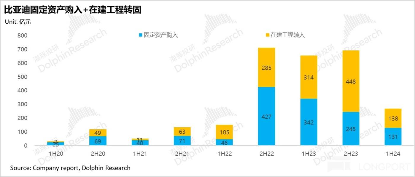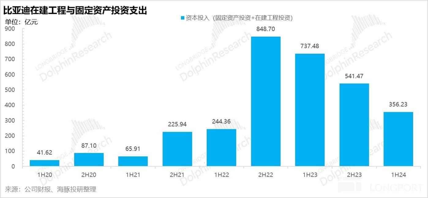 而另外一个原因则是资本开支高峰期和折旧高峰期的期限错配:2021 年下半年开始到 2023 年年底,比亚迪开始大干快上论是固定资产投入 (就是已投产的项目加产能),在建工程 (没有投产、正在建设中的项目) 的投入都是在猛拉状态。到了 2024 年,新能源市场开始肉眼可见的产能过剩,比亚迪在在建工程和固定资本投入上都开始明显放缓。
