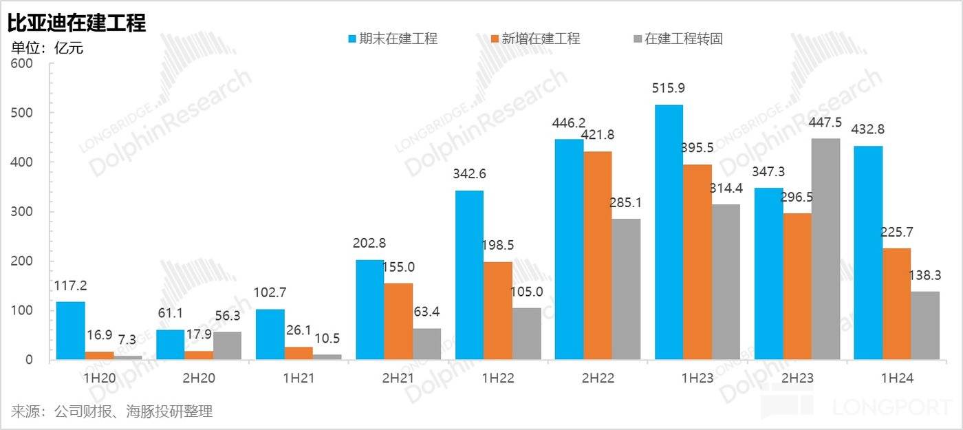 从新增在建工程来看,上一轮的密集的新增在建工程从 2021 年下半年开始,一直持续到 2023 年底,也正好对应着比亚迪汽车和电池产能的密集投入期。